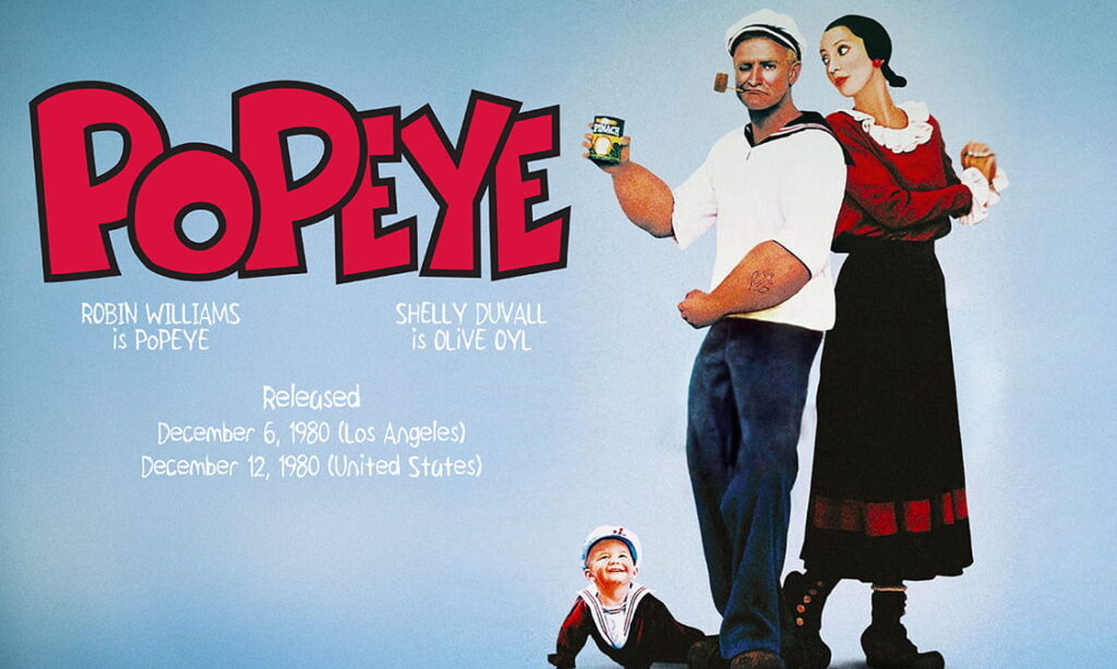 Remember the days of Rip Cord jeans and boom boxes? Imagine stepping into a live-action cartoon in that world—meet Popeye (1980). Directed by Robert Altman and based on the comic strip by E.C. Segar, this musical comedy brought the sailor man to life in a big way. It marked Robin Williams’ first starring film role as Popeye and featured Shelley Duvall as Olive Oyl. The film was shot on location in Malta and built a stylised town of Sweethaven to fully immerse audiences in the comic-strip vibe.